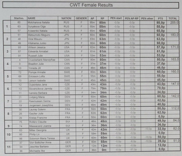 מבין הנשים, הצלילה העמוקה ביותר בוצעה על ידי נטליה מולצ'נובה (הפתעה הפתעה...), עם צלילה קלילה לעומק של 85 מטרים. מנדי ריי קרויקשנק מקנדה צללה לעומק של 80 מטרים. השלישית בעומק הייתה יארמילה הצ'כית, שזכתה במדליית הזהב באליפות של שנה שעברה בסגנון ללא עזרים. היא ביצעה צלילה נקייה לעומק של 70 מטרים.